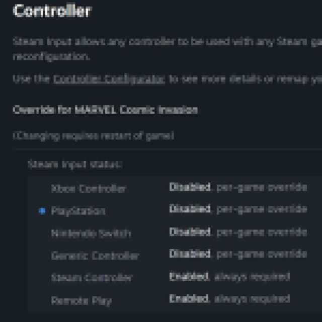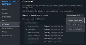 - In the Controller tab, select the Disable Steam Input option under Override for Marvel Cosmic Invasion.