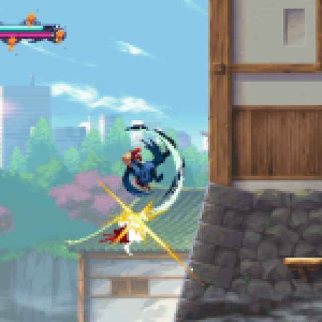 His main attack is a sword slash, which you can perform multiple times. The tougher enemies require more than one hit, or by performing a Hypercharged attack after slashing an enemy carrying the charge for it. Additionally, both Kenji and Kumori can perform a Guillotine Boost, which lets them hop on enemies, dealing damage and traversing different obstacles. When merged, you’ll have a shared moveset, with Kumori’s attacks being represented by a pink bar that fills up as you kill enemies.